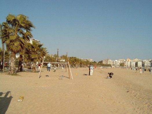 Vor dem langen feinsandigen Strand befindet sich auf einem Betonsockel, auf dem früher die Schleppmaschinerie für die Fischerboote befestigt war, eine Skulptur von Rafael Bartolozzi: "Alfa i Omega".